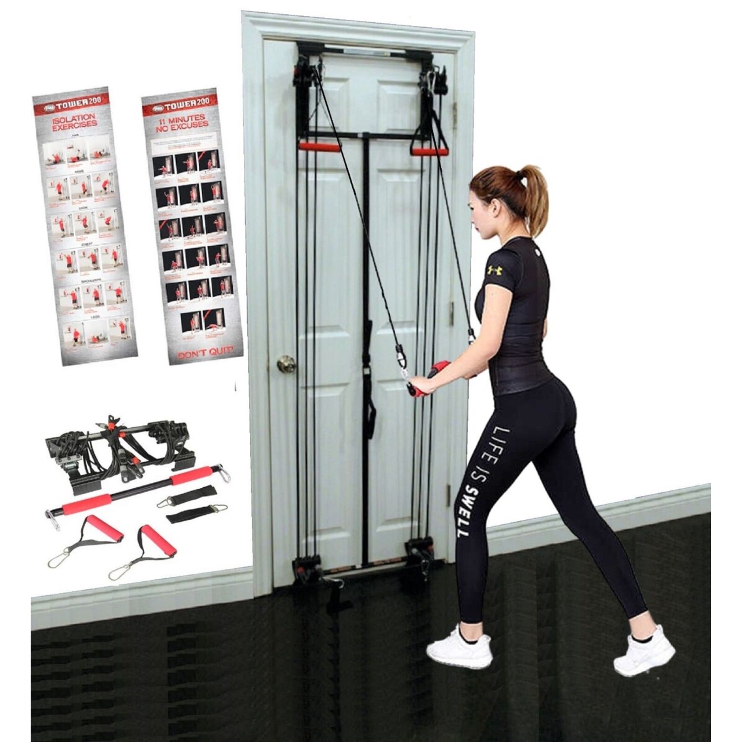 دستگاه بدنسازی TOWER 200 را می توان یک باشگاه بدنسازی کامل بر روی درب معرفی نمود؛ با انجام حدود 281 حرکت مختلف ، یک باشگاه کامل و کم جا و با هزینه بسیار مناسب در منزل یا محل کار خود داشته باشید . مهمترین ویژگی دستگاه تاور 200 مونتاژ بسیار راحت و نصب بسیار ساده آن می باشد و وزنی حدود 5 کیلوگرم دارد. این دستگاه دارای 3 جفت کش با ضخامت های مختلف ( نازک – متوسط – ضخیم ) می باشد که دارای سری به رنگ های قرمز و خاکستری و مشکی است. این دستگاه دارای پوستر رنگی بزرگ دوطرفه جهت نشان دادن حرکت به صورت تصویری و فیلم آموزشی اورجینال قاب دار برای استفاده صحیح و آسان است ، همچنین جهت عمر بیشتر قرقره های دستگاه و طول عمر بیشتر خود دستگاه لازم است بعد از هر 10 ساعت استفاده آن را روغن کاری نمایید تا سطح اصطحکاک آن کم شود و باعث ساییدگی نشود. محتویات دستگاه TOWER 200 شامل پوستر آموزشی و دفترچه آموزشی 281 حرکت و DVD آموزشی می باشد. دستگاه بدنسازی TOWER 200 وسیلهای مناسب برای استفادهی تمامی ورزشکاران می باشد و در آخر میتوان گفت تمام ویژگیهای ذکر شده در کنار طراحی زیبای این محصول، آن را به انتخابی مناسب برای شما تبدیل خواهد کرد.